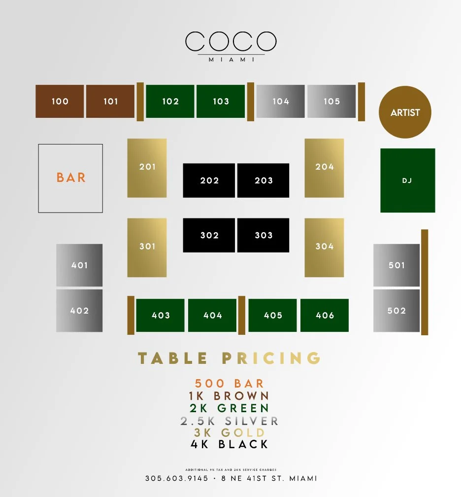 COCO MIAMI requires a deposit payment of the chosen table section at the time of reservation to secure your booking.